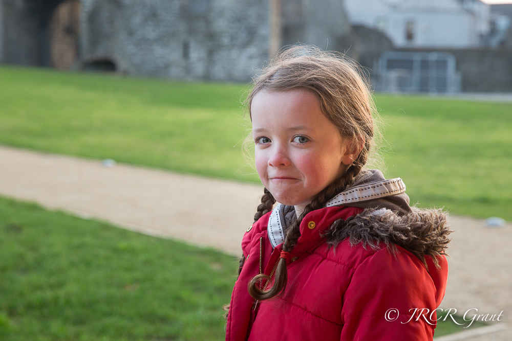 A young girl grins with mischief