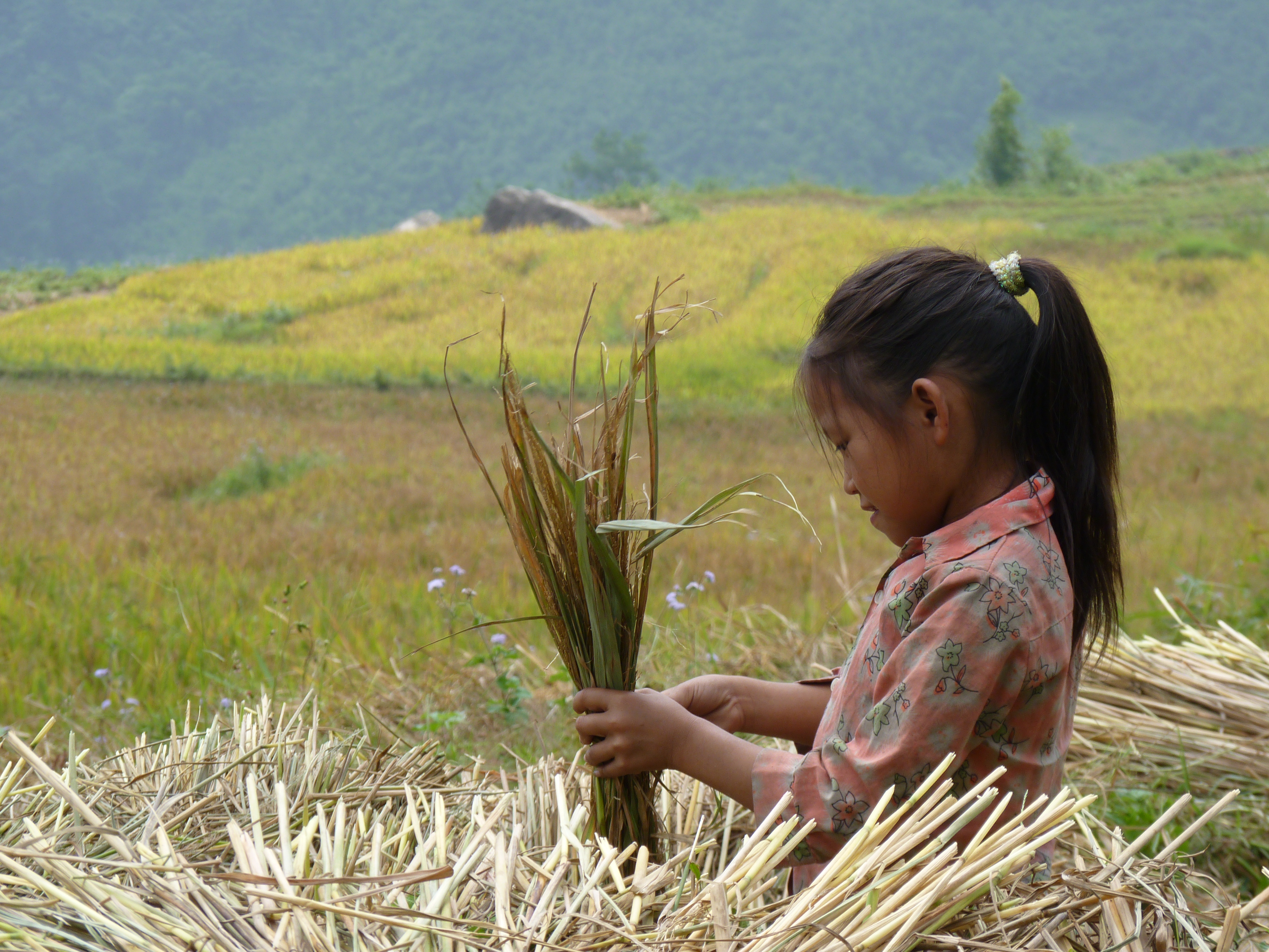 In the first picture below a young girl ties a sheaf in a field next to a track. In the second, a group of three Black Hmong girls dressed in traditional clothes take a break from using their scythes to watch a run-away buffalo go charging down the carefully constructed tiers of paddy terraces.
