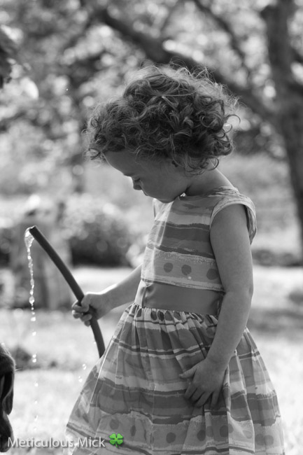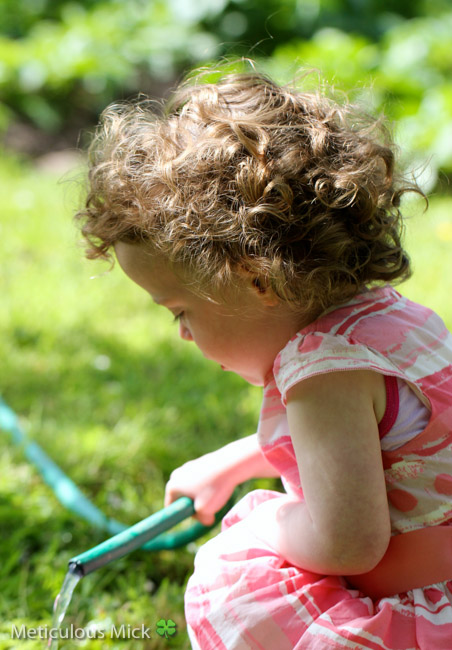 So to our new assistant, Freida. Like many young starters she likes to mess around with water, do a bit of weeding and sample the produce while still in the garden. In the pictures below we can see her high levels of concentration and application as she wields the hose under the apple tree.