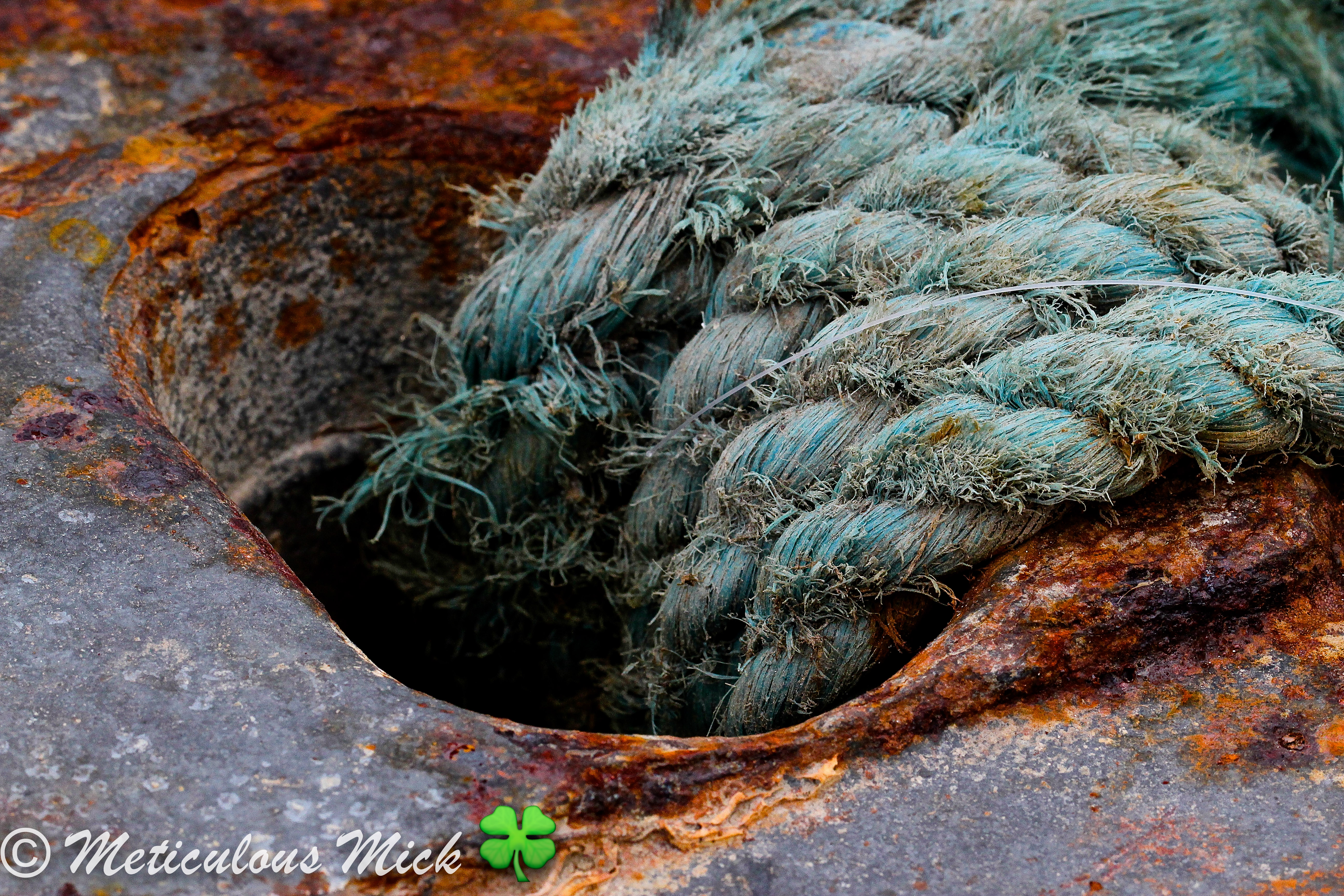 For now this rope and the heavy metal weight seem to be bound intrinsically together. However, signs are there too for a future parting; the rope is old and starting to fray while the metal is corroding, being eaten away by rust. These objects were stood on the quay-side by a pile of fishing gear, the salty spray and air no doubt hastening the rusting process.