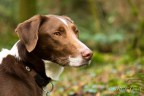Portrait of a beautiful brown and white mongrel hound, eyes looking in the wood. Stunning.