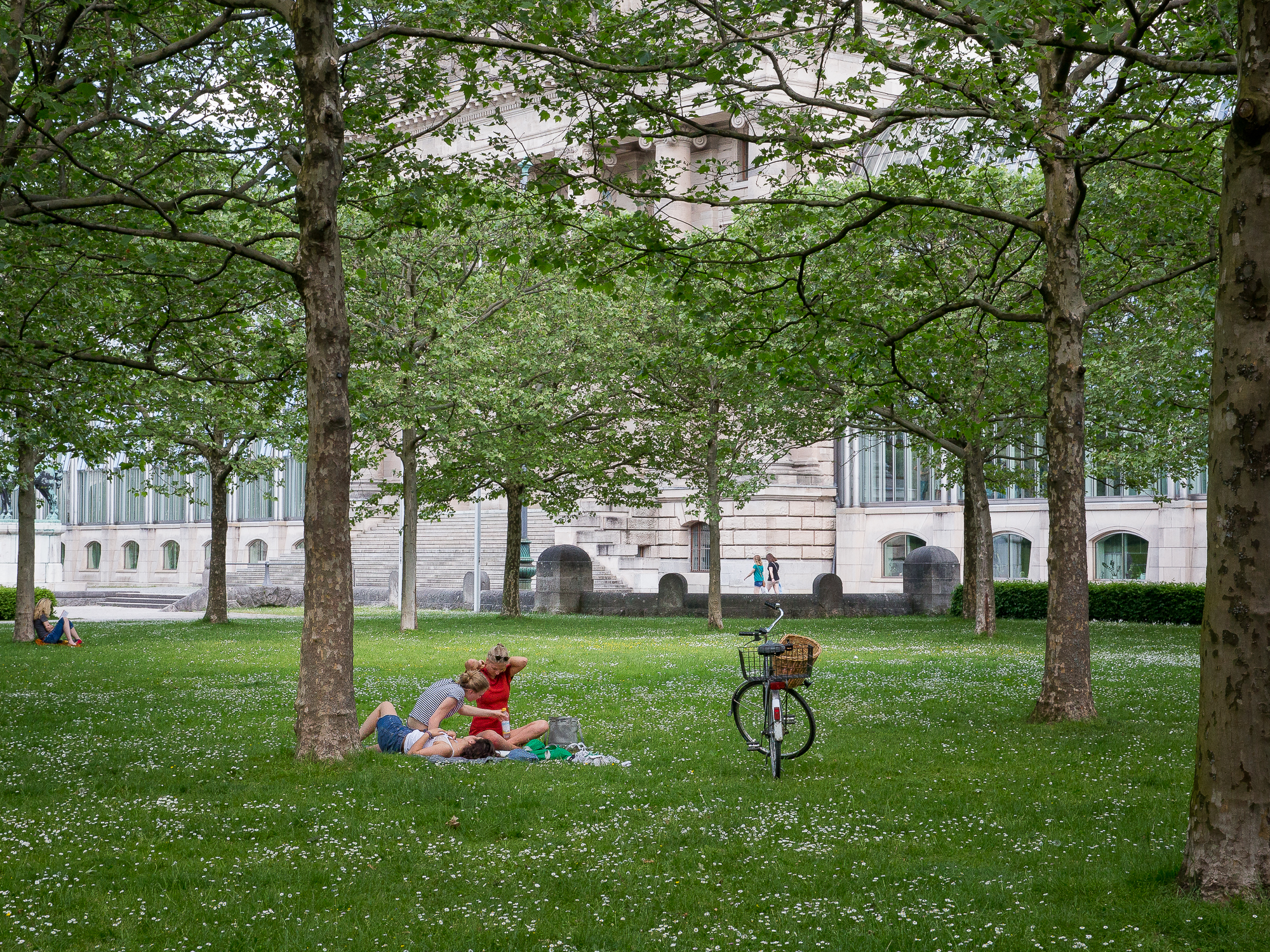 Here the scene is at the edge of the Hofgarten, municipal buildings featuring in the background.