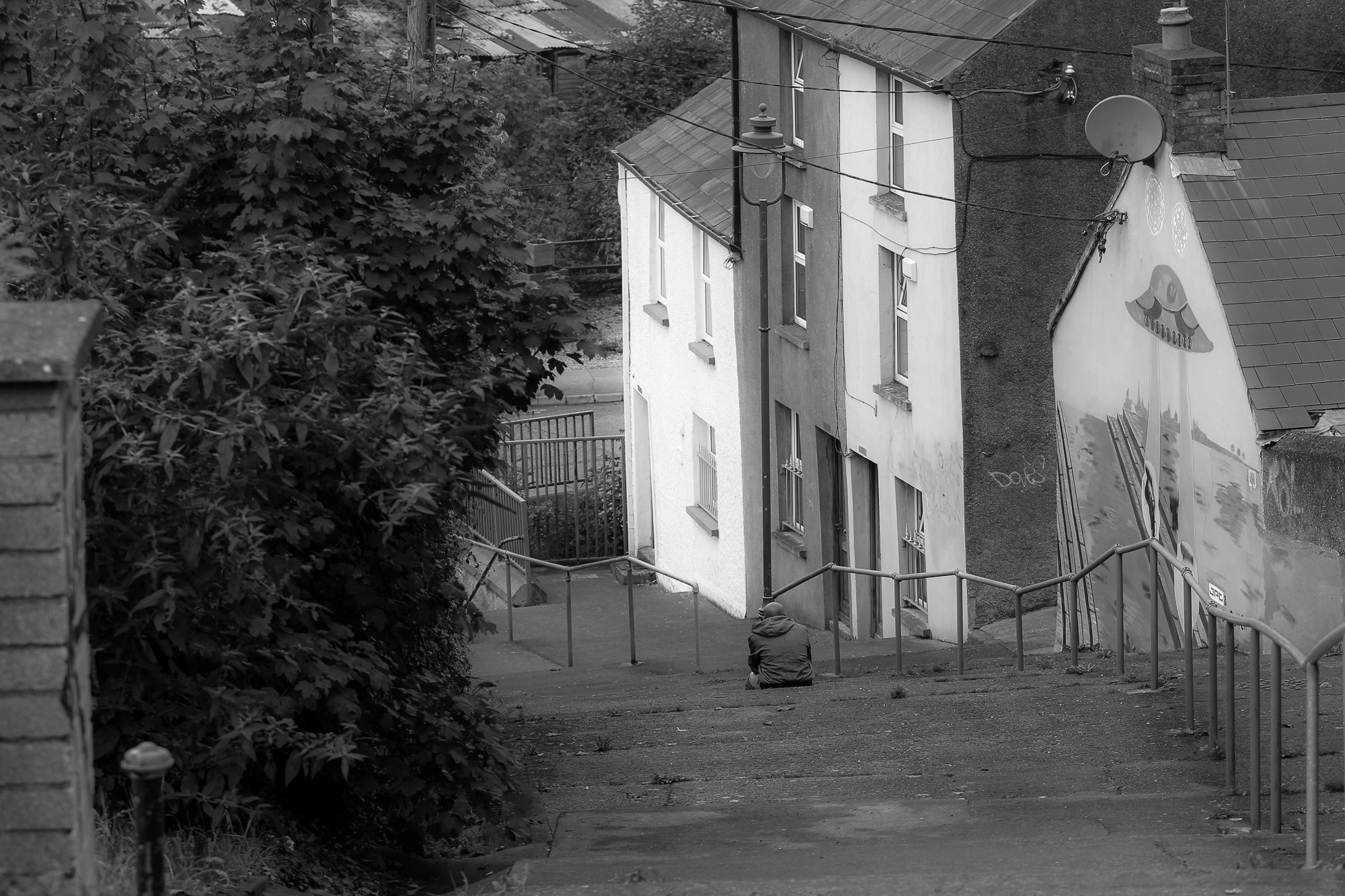 Man buries his head in hands while sitting on steps, smoking a cigarette
