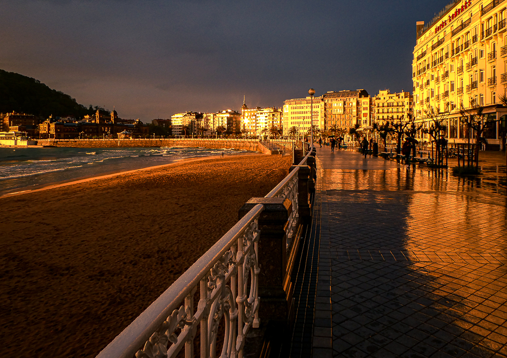 The natural colouring provides a sepia effect, the umbrella striking and the background railings all help to provide an image of a wet seaside promenade from many years ago. The reality is the image was taken in 2019 in San Sebastian, a fabulous city in the Spanish Basque region.