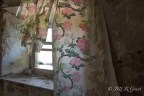 Shredded, rose patterned curtains billow in the wind