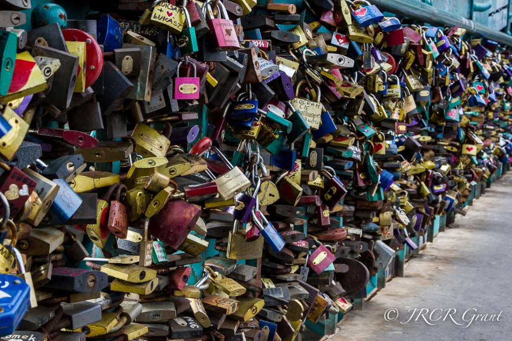 Padlocks compete for space on tusks Bridge in Wroclaw, Poland
