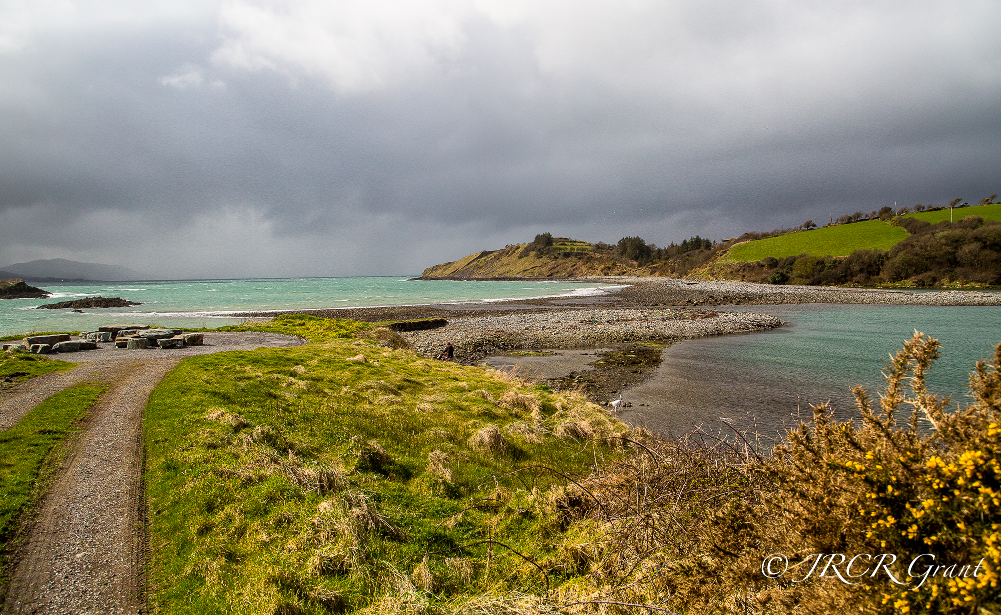 A storm approaches Whiddy Island, the sea turning aqua.